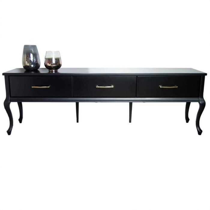 Oryginalna i ponadczasowa szafka RTV pod telewizor to doskonały mebel do salonu w stylu glamour. W salonie znajdzie swoje miejsce pod telewizorem, zaś w sypialni świetnie sprawdzi się jako komoda. Niepowtarzalna wygląd podkreślają stylizowane nogi, które idealnie wpasują w styl klasyczny jak i nowoczesny. Ponadto, prawie 25 cm nogi w szafce RTV dają przestrzeń, prosta forma szuflad sprzyja utrzymaniu czystości i nadaje prostolinijny, nie przesadzony wygląd. Szerokie na 50 cm i głębokie na prawie 35 cm szuflady są niezwykle pojemne i komfortowe w użytkowaniu. Wszystkie materiały zastosowane do produkcji komody pod telewizor charakteryzuje wysoka jakość.