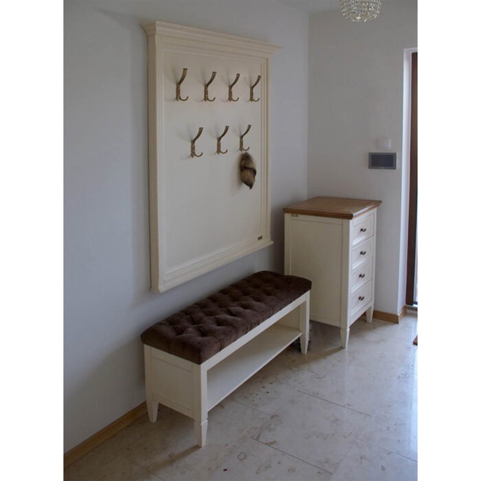 Pufa z półką do przedpokoju w połączeniu z dekoracyjnym panelem w klasycznej ramie z wieszakami to idelany zestaw do przedpokoju. Nie ma nic lepszego niż połączenie praktycznych i eleganckich rozwiązań.