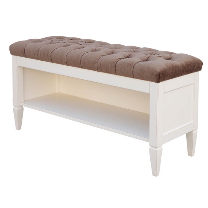 Pufa z półką w kolorze ecri i brązową pikowaną tapicerką jest propozycją wyposażenia wnętrza holu lub przedpokoju. Na zamówienie można określić szerokość jak i głębokość pufy a nawet zamknąć półkę fronte i zastosowac dzwigane siedzisko.