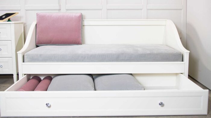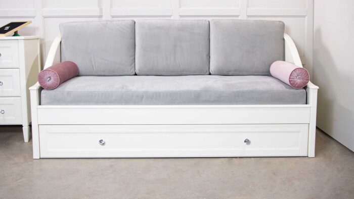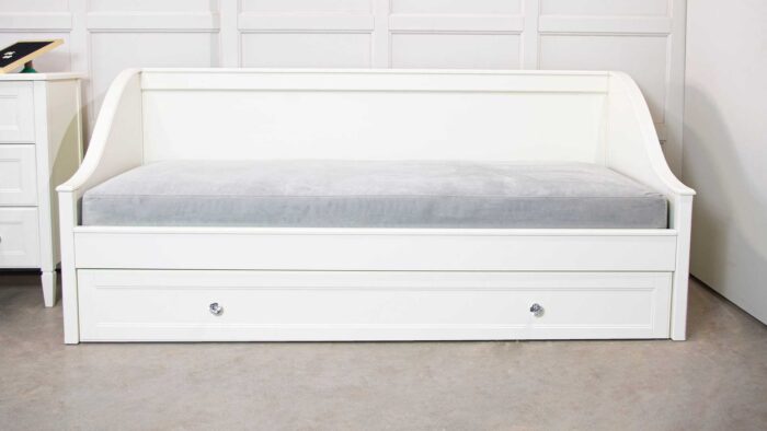 Przedstawiamy białe łóżko w stylu glamour do pokoju małej księżniczki i nastolatki. Elegancki i szykowane łóżko posiada pojemną, wysuwną szufladę w której zmieścisz dodatkowy materac lub poduszki. Łóżko nie tylko charakteryzuje oryginalne wzornictwo ale również funkcjonalność ponieważ na co dzień łóżko idealnie sprawdzi się jako sofa zaś wieczorem pełni funkcję łóżka. Co więcej, łóżko jest niezwykle wygodne, ponieważ pod tkaninowym pokrowcem, znajduje się oryginalny pokrowiec materaca. Dzięki temu pokój dziewczynki lub nastolatki spełni funkcję saloniku dla gości.