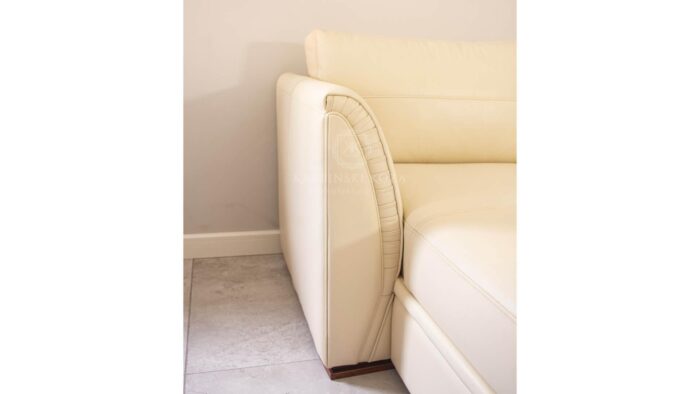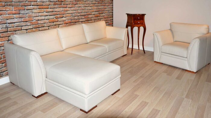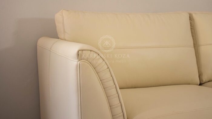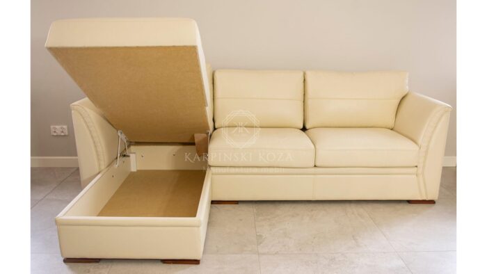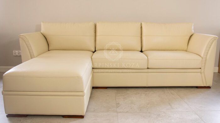 Bardzo prostu, klasyczny narożnik o wysokim boku oraz wygodnymi poduchami na oparciu. Kremowy narożnik wykonany z skóry w kolorze kremowym. Narożnik w literę L lewostronny. Narożnik z wyokimi profilowanymi bokami o ciekawym wykończeniu w zakładki ręcznie układane. Narożnik do dołu na 2 cm nóżkach. Wygodne oparcie gwarantują poduchy przyczepione na rzep lub bez ( możliwość rezygnacji z rzepów). Siedzisko narożnika wykonane z dwóch luźnych poduch oraz jednej stałej, która jest częścią wysuniętej leżanki. Pod wysuniętą częścią narożnika znajduje się obszerny pojemnik, który z łatwością podnosi się do góry.
