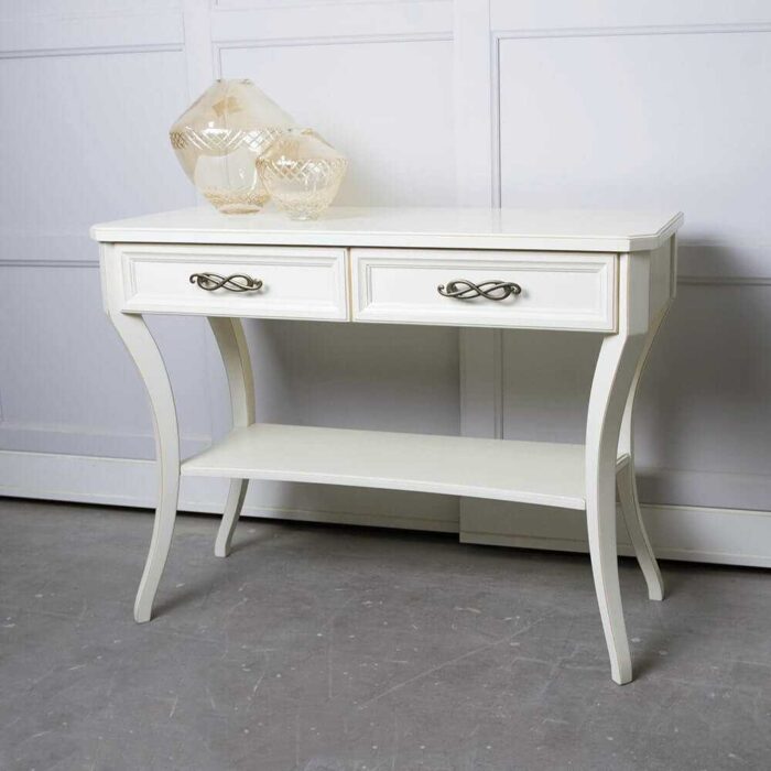 Orginalna konsola z dwoma szufladami, na wklęsłych nogach. Biala konsola glamour z włsokimi uchwytami.