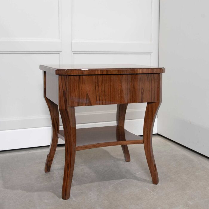 Nocna szafka art deco, lakierowana na wysoki połsyk. Szafka nocna fornirowana, na blacie składana intersja. Szafka nocna z półką i szufladą.