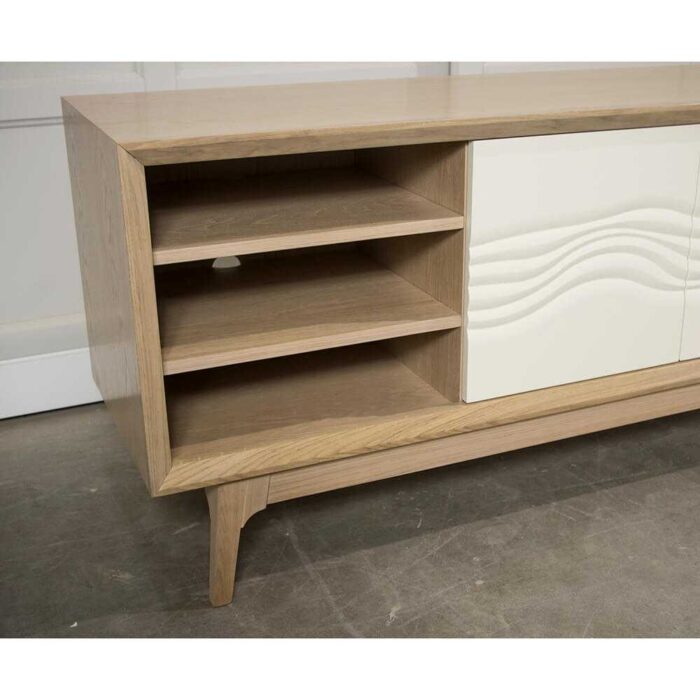 Nowoczesna, dębowa szafka z frontami mdf. Szafka pod telewizor na nóżkach o idelanej wysokości dla posiadaczy bezprzewodowych odkurzaczy. Szafka RTV z otwieranymi drzwiczkami posiada również wnękę z półkami na sprzęt.