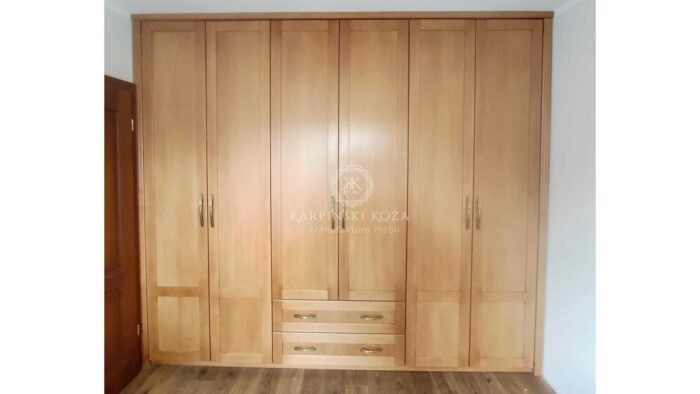 Klasyczna szafa na wymiar do zabudowy. Szafa z frontami drewnianymi do samej góry wykonana pod indywidualny projekt. Indywidualnie zaprojektowana szafa pozwala lepiej zaplanować swoją przestrzeń a nawet ułatwia codzienny rytuał ubierania się. Prezentowana otwierana garderoba posiada miejsce na deskę do prasowania oraz suszarkę na ubrania. Rozmieszczenie drążków oraz półek również nie jest przypadkowe. Jedna półka zaprojektowana pod aktówki zaś drążki pod koszule, spodnie i płaszcze.