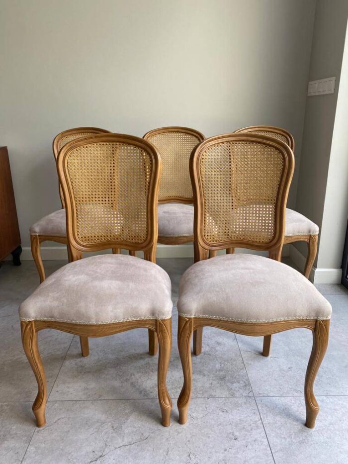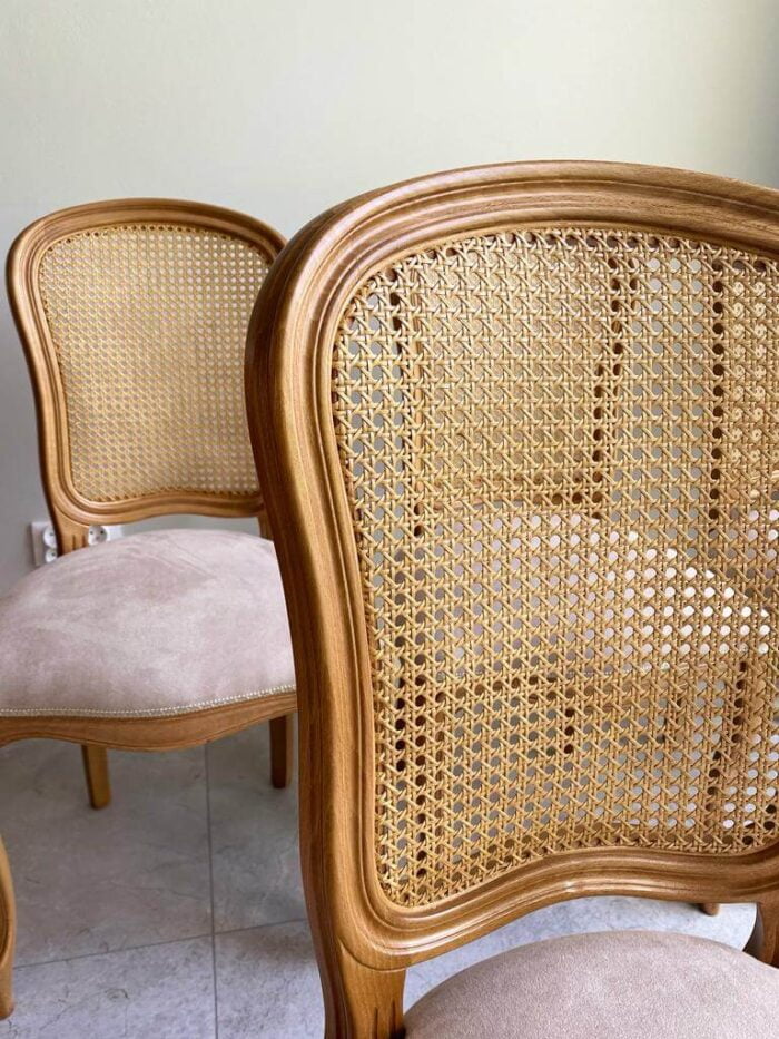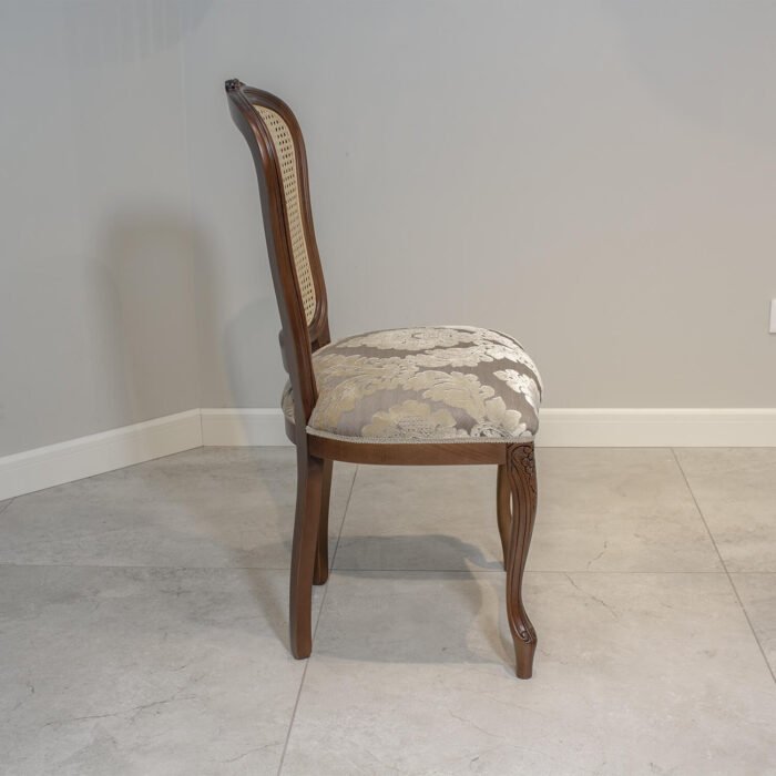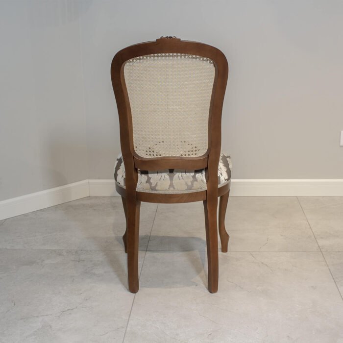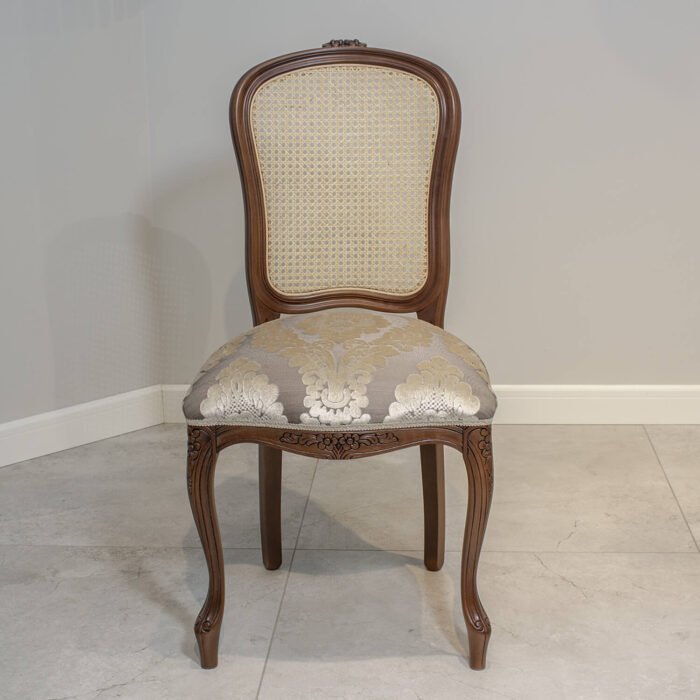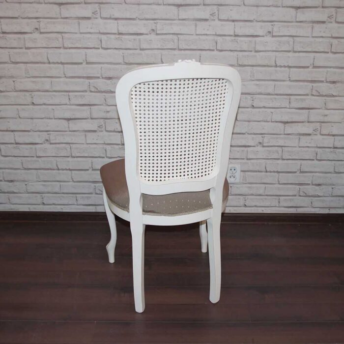 Włoskie krzesło z ratanowym z oparciem, niezwykle lekko wyglądające w każdym wnętrzu. Plecy krzesła są lekko wyprofilowane . Krzesło z ratanem idealnie pasuje do wnętrz w stylu prowansalskim, francuskim oraz angielskim. Oryginalne włoskie krzesło charakteryzuje się lżejszą konstrukcją poprzez rattan. Krzesło rattanowe ma wygodne siedzisko dzięki zastosowaniu sprężyn i wysokoelastycznej piance. Aby podkreślić charaketr i styl krzesła w wnętrzu można wybrać ciekawe wykończenie ćwiekami (taśma gwoździkowa) lub torsatką.