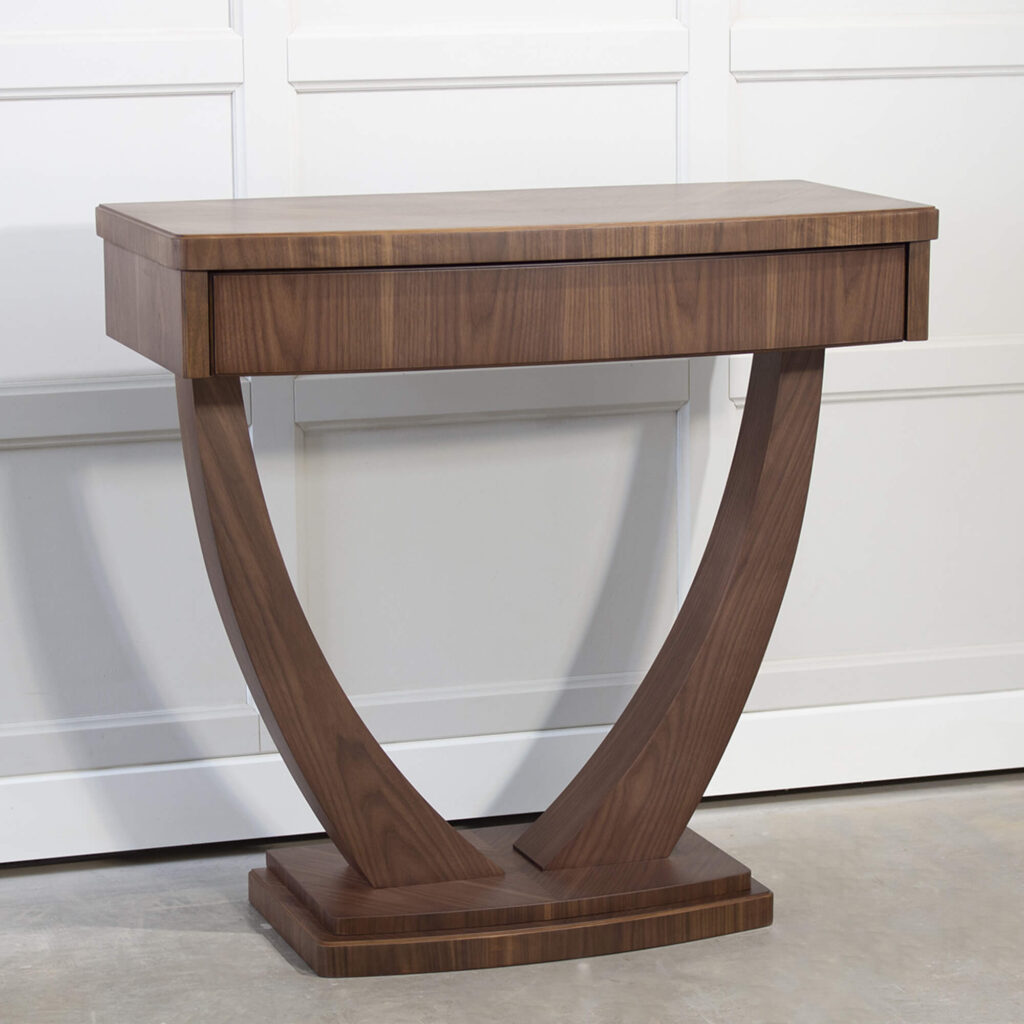 Nasza kolekcja Matrix to meble szczególnej klasy wykonania, które od samego wejścia tworzą niepowtarzalną magie wnętrz ar-deco. W naszej ofercie znajdziesz również konsole w stylu art deco z szufladką na dwóch półłukach. Konsolka parta na stabilnej, podstawie i dwóch nogach idelane wpasuje się do przedpokoju, salonu lub korytarza. Elegancka Konsola posiada szufladkę a na jej blacie znajduje się intersja. Intersja na blacie to charakterystyczny element dla mebli w stylu art-deco, jednak nie jest on wymagany.
