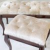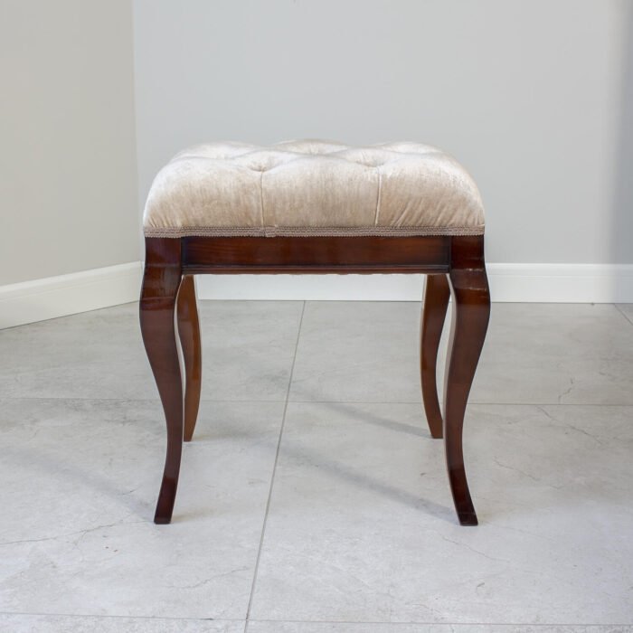 Pufa glamour na drewnianych nogach typu ludwikowskiego z strą kantą. Pufa wykończona szurkiem wokół głęboko tapicerowanego siedziska. Guziki wykonane z tkaniny lub kryształowe na zamówienie.